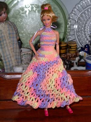 ![]() This is a Barbie dress I crocheted out of baby/sport yarn. I designed the simple halter dress for a friend who wanted to make a Barbie dress for her daughter. I haven't even created a pattern yet--I just designed and fitted as I crocheted. The Barbie is one of my customized dolls. I didn't have a doll stand with me, so I stood her in front of Mom's china cupboard. |