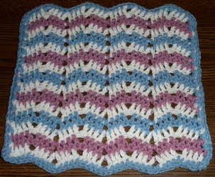 Colors: Blue/pink/white (shown), blue/white, pink/white, red/blue (shown) Size: Approx. 9" square. To order: Refer to "ripple dishcloth" and above-listed color combinations. Custom: E-mail with requests for different combinations. These can be made quickly. Price: $2.50 Shipping: $1 for one dishcloth, $.50 for each additional dishcloth shipped at the same time. |