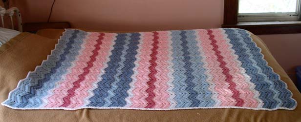 Colors: Light blue, medium country blue, pink, rose. Size: Approx. 48" x 60" To order: Refer to "Ripple Afghan #1" Custom: E-mail with color requests. Price: $50 Shipping: $12 for one afghan, $6 for each additional afghan shipped at the same time. |