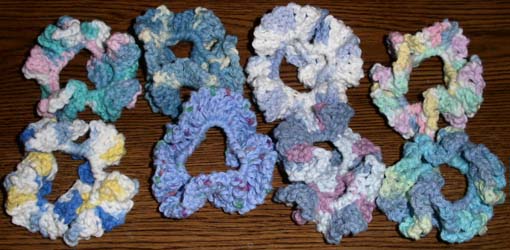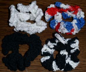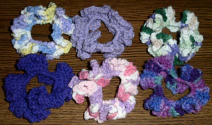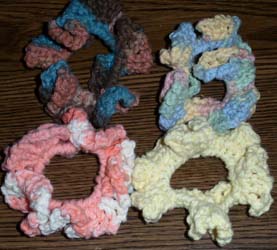 Colors: Assorted - ask. Size: Approx. 4" - hard to tell because they are so ruffly. To order: Refer to "scrunchies" and give color preference. Custom: E-mail with requests. Price: $1.25 Shipping: $1 for one scrunchie, $.25 for each additional scrunchie shipped at the same time. |