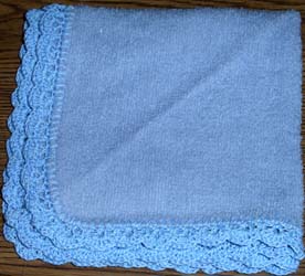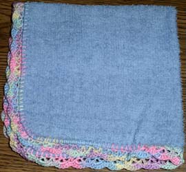 Colors: Colors will vary slightly with dye lot. The washcloths are a medium country blue. Edgings available: Medium blue (shown), pink variegated (shown), blue variegated, rose, ivory (at your own risk - washcloth may fade), white (at your own risk - washcloth may fade) Size: Approx. 13" including edging. To order: Reference item by above-listed color combination. Custom: E-mail with requests for different combinations. Edging colors available are listed above. Price: $2.95 Shipping: $1 for one washcloth, $.50 for each additional washcloth shipped at the same time. |