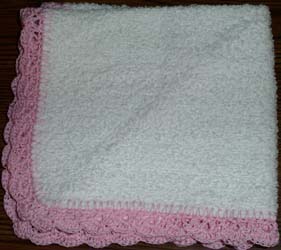Colors: Edging colors will vary slightly with dye lot. The washcloths are white. Edgings available: White, pink (shown), light blue, pink variegated (at your own risk - edging may fade), blue variegated (at your own risk - edging may fade), blue (at your own risk - edging may fade) Size: Approx. 13" including edging. To order: Reference item by above-listed color combination. Custom: E-mail with requests for different combinations. Edging colors available are listed above. Price: $2.95 Shipping: $1 for one washcloth, $.50 for each additional washcloth shipped at the same time. |